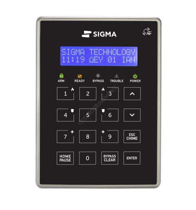 Πληκτρολόγιο αφής με 16 φωτιζόμενα πλήκτρα και οθόνη LCD μπλέ χρώματος με λευκά γράμματα.Αναγνώστη RF-ID για κάρτες προσέγγισης.