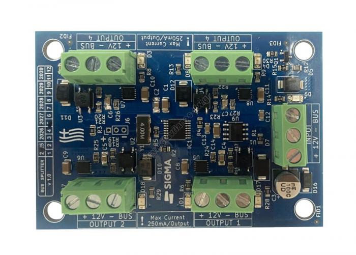 Δέχεται στην είσοδό του [ +12V - Bus ] σήματα από οποιονδήποτε πίνακα SIGMA και τα διανέμει αυτόματα σε τέσσερις ανεξάρτητες εξόδους.