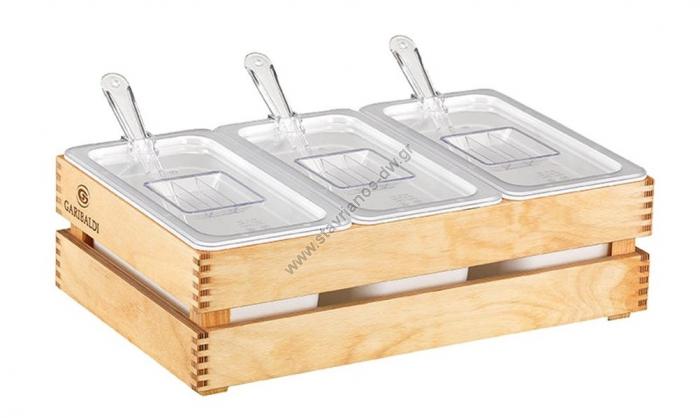 Ξύλινη αδιάβροχη βάση GN1/1 με 3 δοχεία με καπάκια & κουτάλες DW-36018