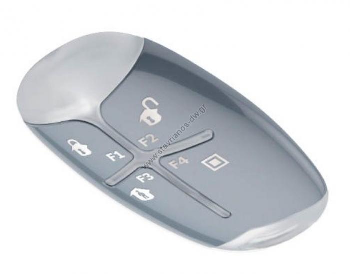 Πομπός τηλεχειρισμού αμφίδρομης επικοινωνίας με 4 μπουτόν τα οποία μπορούν να προγραμματιστούν μέσω του πίνακα.