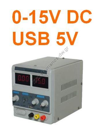 Τροφοδοτικό σταθεροποιημένο ρυθμιζόμενο 0-15VDC / 2A με ενδείξεις LED διαθέτει και εξοδο USB YH-1502D