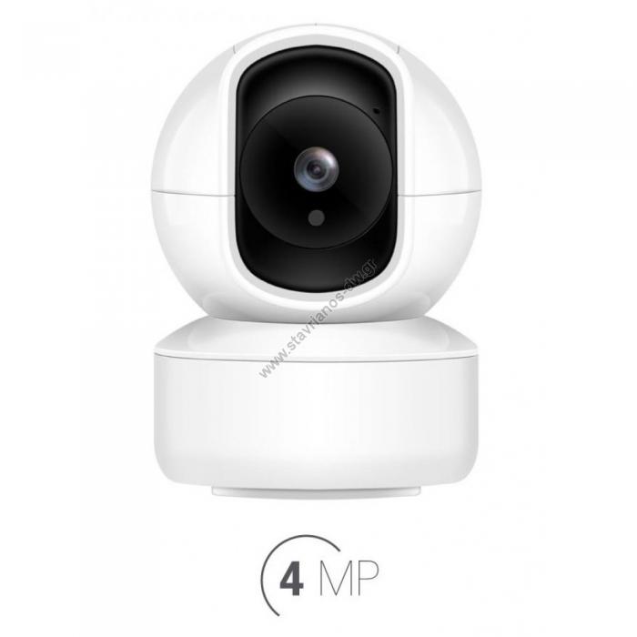 Έγχρωμη κάμερα 4MP PTZ Wifi, D/N, εσωτερικού χώρου.Αισθητήρας: 1/3’’ 4.0M Pixel.Ανάλυση: 4MP (2560 X 1440).Φακός: 3.6mm.Ενσωματωμένο φίλτρο IR-Cut.Ελάχιστη φωτεινότητα: 0.01 Lux11 υπέρυθρα LED, μέγιστης εμβέλειας 15 μέτρα.Ενσωματωμένο μικρόφωνο και ηχείο για επικοινωνία με το χώρο σας.Γωνία κίνησης: Κατακόρυφα 0°~90°, Οριζόντια 0°~355°.Σύνδεση μέσω Wifi με ένα πλήκτρο.Υποστηρίζει WIFI(IEEE802.11b/g/n).Διαθέτει έξοδο LAN 10/100Mbps RJ-45.Δυνατότητα εγγραφής σε μνήμη SD έως 128GB. (δεν περιλαμβανεται)Δυνατότητα απομακρυσμένης παρατήρησης μέσω Internet Explorer, Firefox.Δυνατότητα εγγραφής σε κάρτα SD, αποστολής email με φωτογραφίες σε περίπτωση ανίχνευσης κίνησης ή μεταφόρτωση σε FTP.Δωρεάν εφαρμογή για απομακρυσμένη διαχείριση και εγγραφή σε Ηλεκτρονικό υπολογιστή.Δωρεάν εφαρμογές για iPhone, Android για να παρακολούθηση της κάμερας από κινητό.Πρωτόκολλα: TCP/IP、UDP/IP、HTTP、DHCP、RTSP、RTMP、MUTP.Υποστηρίζει πρωτόκολλο ONVIF.Τροφοδοσία: 5 VDC.Κατανάλωση: 3.5W.Θερμοκρασία λειτουργίας: 0~55° C.Διαστάσεις: 110 x 80 mm.