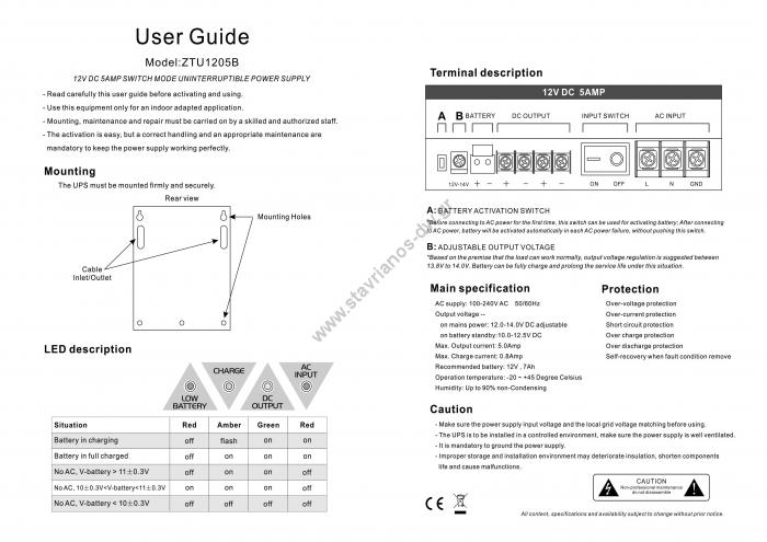 Τροφοδοτικό για CCTV με λειτουργία Back-up με τάση εξόδου 12V DC και ρεύμα εξόδου 5A max ZTU-1205B